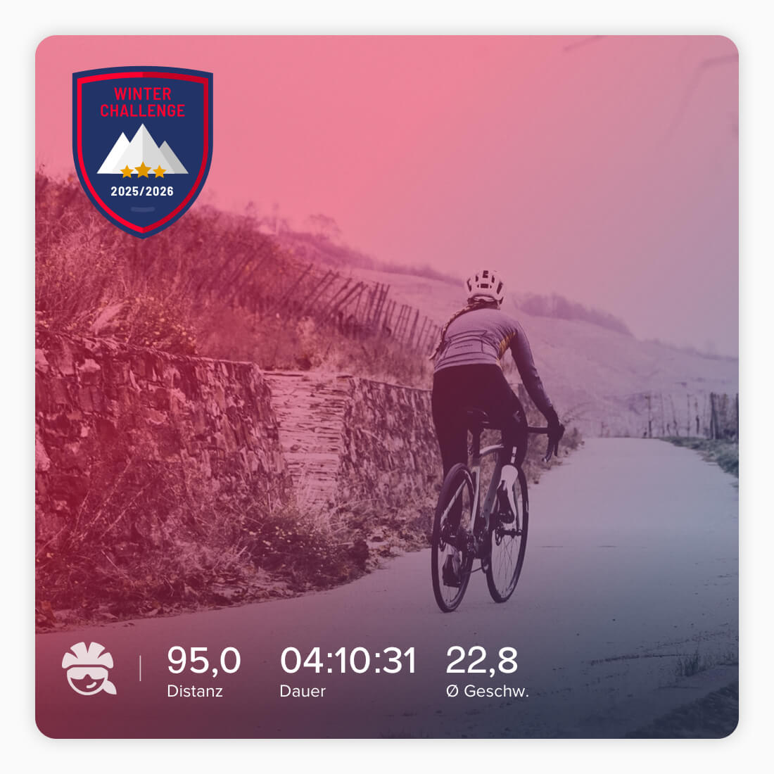 Entflieh der Kälte und der fehlenden Motivation und nimm - alleine oder zusammen mit Freunden - an unserer Winter Challenge vom 01.11.2025 bis 31.03.2026 teil. Es winken Monatssiege und am Ende der Challenge verleihen wir die Krone des Winters!