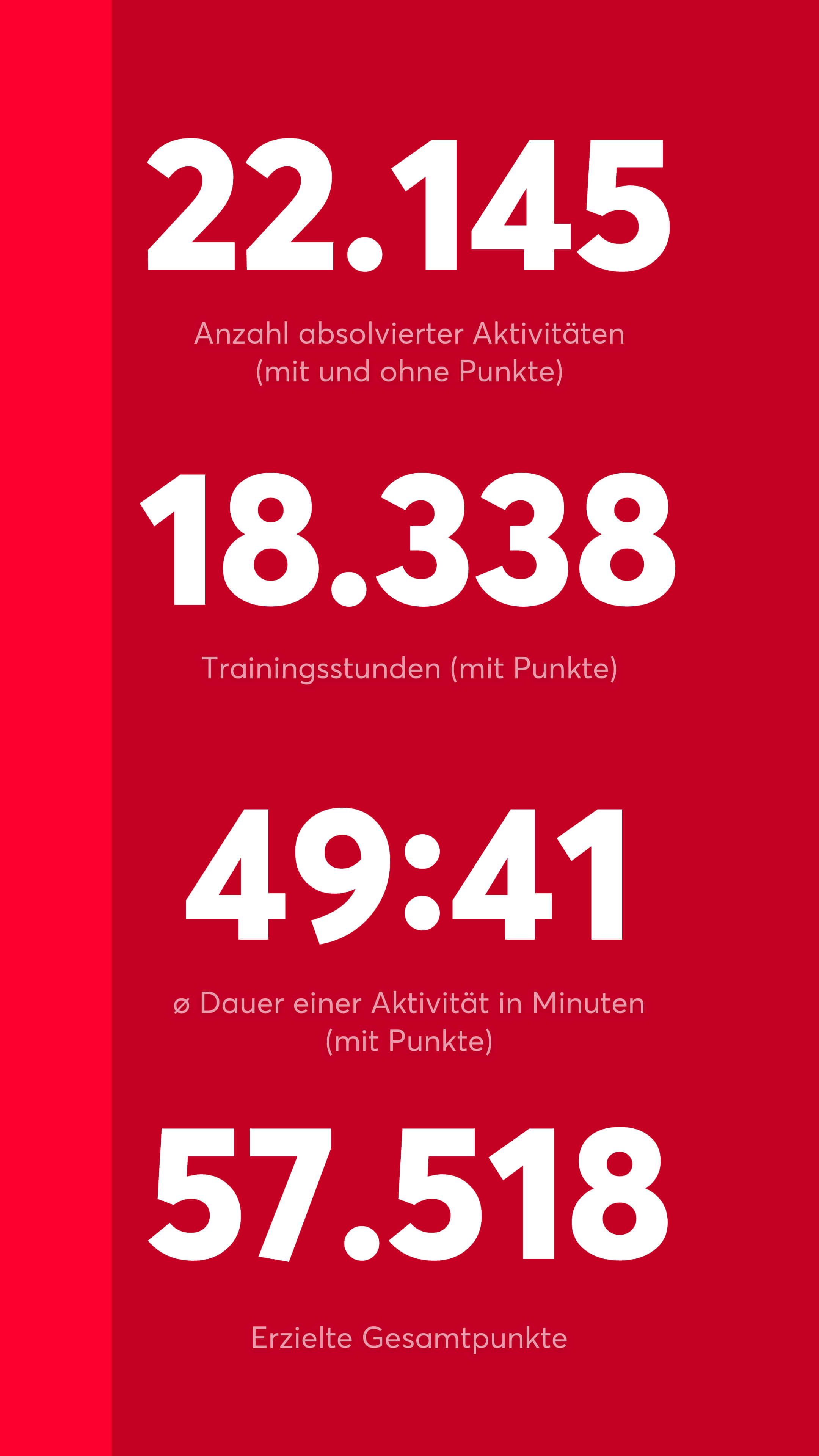 In der Winter Challenge 2024/2025 wurden insgesamt 57.518 Punkte erzielt. Dabei wurden 18.338 Stunden trainiert und 22.145 Aktivitäten absolviert.