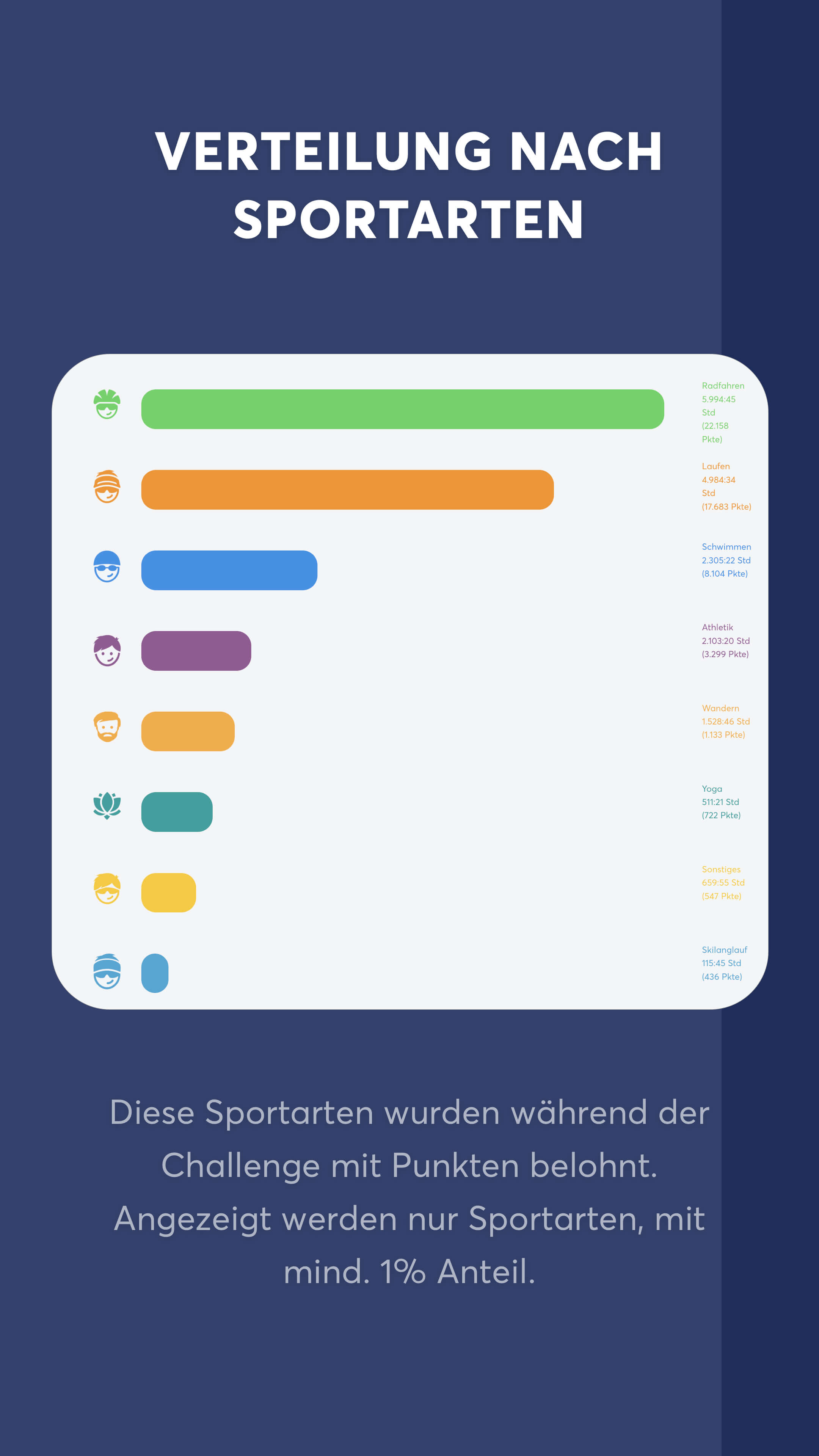 Um das Ranking auf dem Leaderboard so neutral wie möglich zu gestalten, wandeln wir die jeweils absolvierte Dauer in Punkte um. Dadurch bleibt es fair für alle. Erlaubt sind alle Sportarten. Das Leaderboard wird täglich mehrfach neu berechnet.