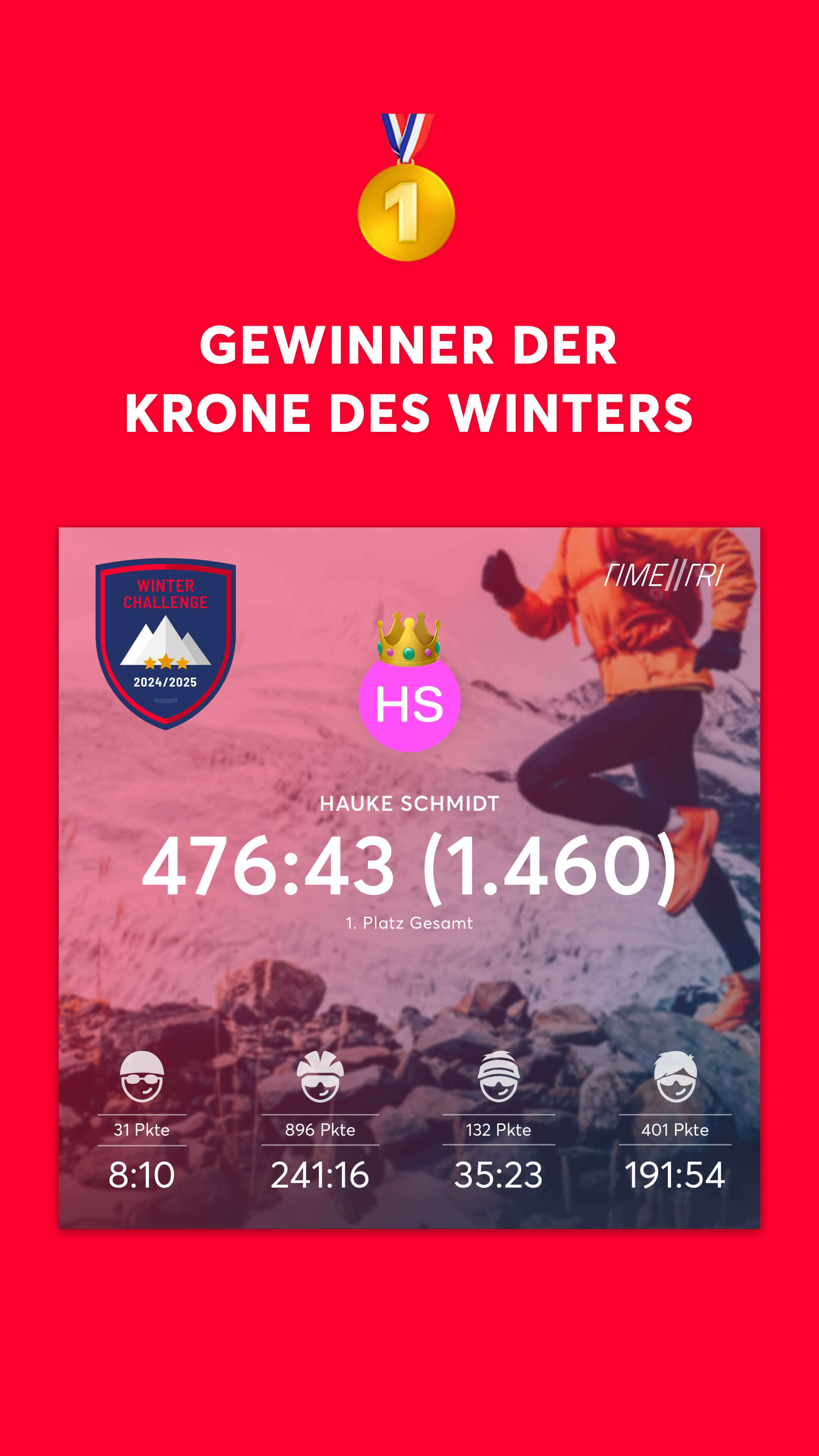 Im Entdecken-Bereich unserer TIME2TRI Athlete App für iOS und Android ist die offizielle "Winter Challenge" Community zu finden. Tretet ihr bei, wenn ihr euch mit anderen Teilnehmern in Kontakt kommen und euch austauschen möchtest. Die jeweiligen Gewinner werden in der Community bekanntgegeben.